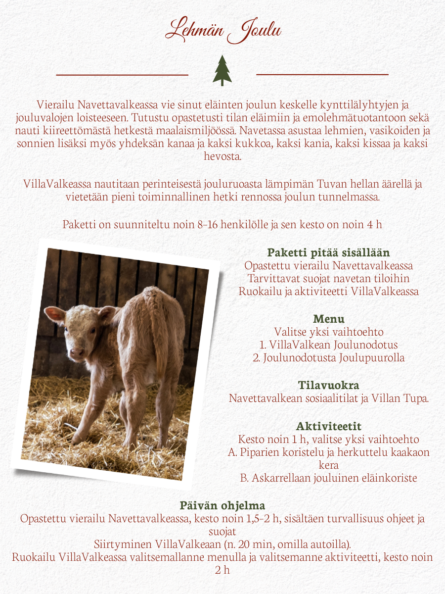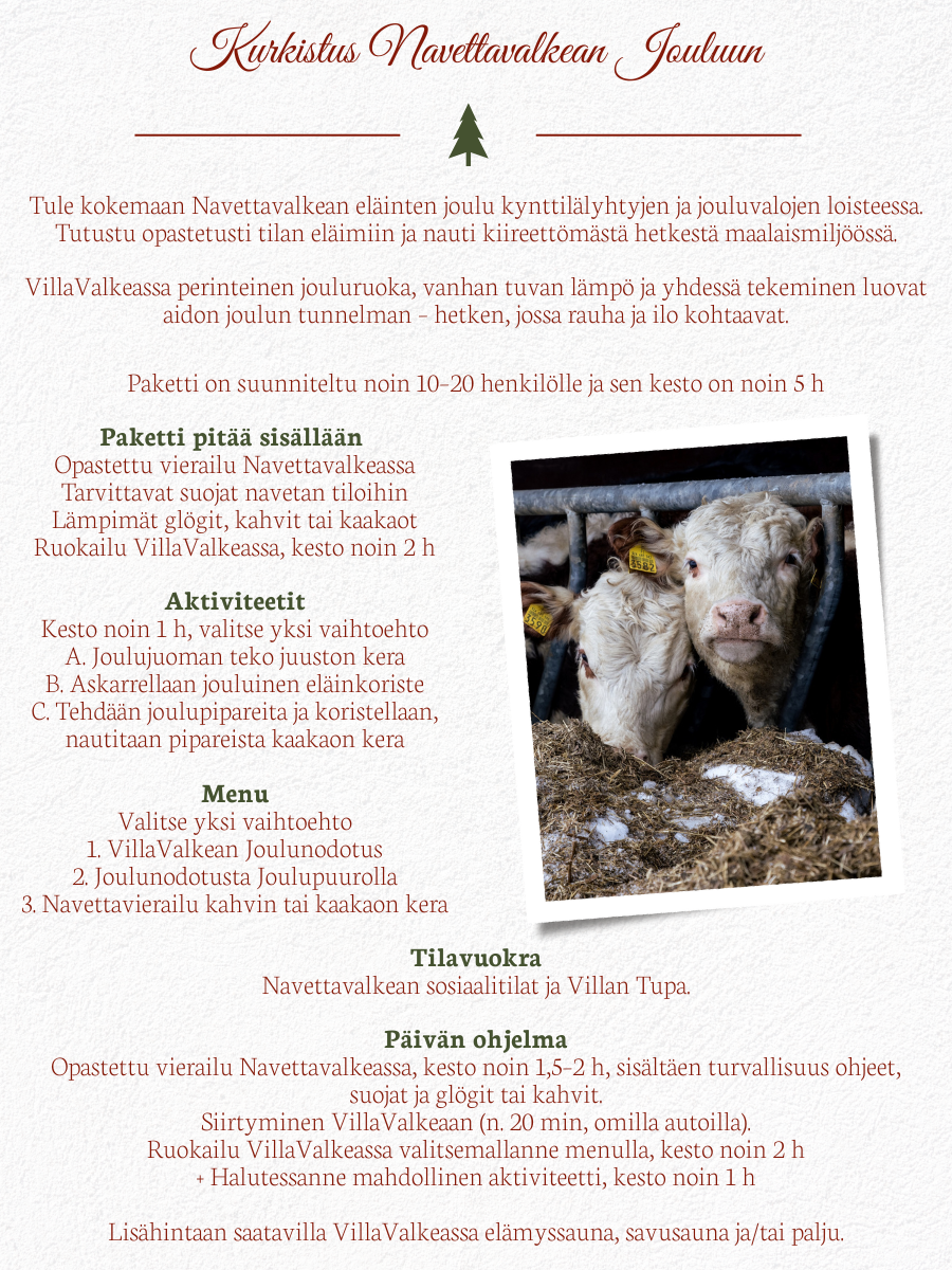 VillaValkeassa järjestät ikimuistoiset pikkujoulut rauhallisessa maalaismiljöössä. Valitse mieleisesi pikkujouluohjelma ja aktiviteetti: tee oma mocktail joulujuoma ja pieni askartelu, leivo ja koristele pipareita tai lähde kynttiläpolulle villasukat jalassa.