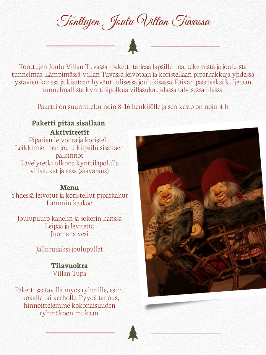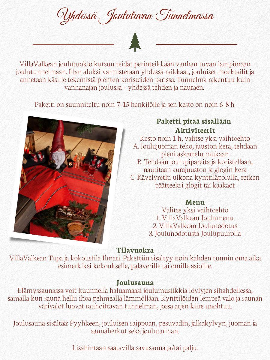 Kanelin, neilikan ja kuusen tuoksu kietoo villan tuvan pehmeään jouluiseen tunnelmaan. Tervetulotoivotuksen ohessa tarjoilemme lämmintä talon glögiä, joka on valmistettu oman puutarhan omenoista – glögin höyrytessä mukissa ja mieli rauhoittuu joulun odotuksessa. Kynttilöiden lempeä valo luo ympärilleen rauhaa, jossa ystävyys ja joulumieli kohtaavat.