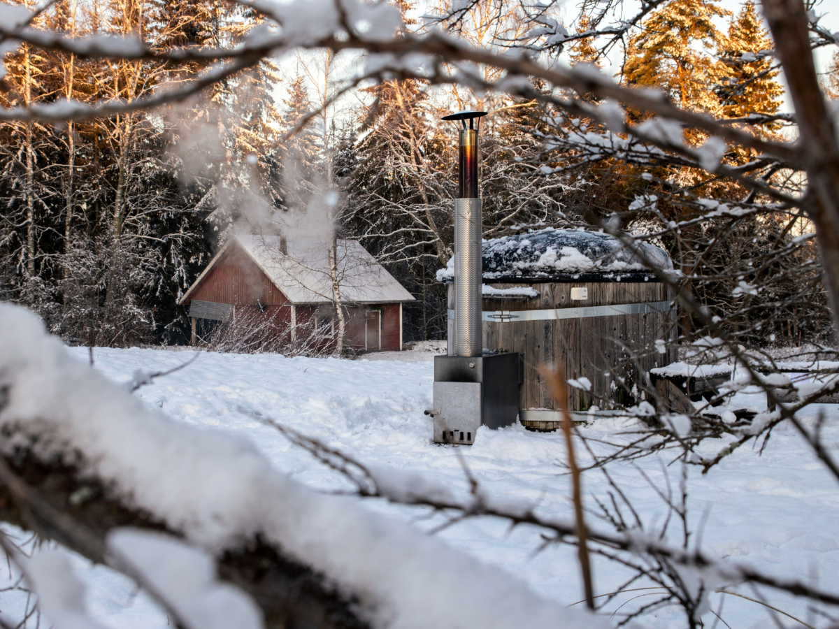 Palju tai perinteisemmin kylpytynnyri lämpenee höyryävän lämpimäksi myös saunan yhteydessä. Lämmin vesi ja kylmä pakkastuuli luovat erilaisen, mutta yhteensopivan elämyksen.