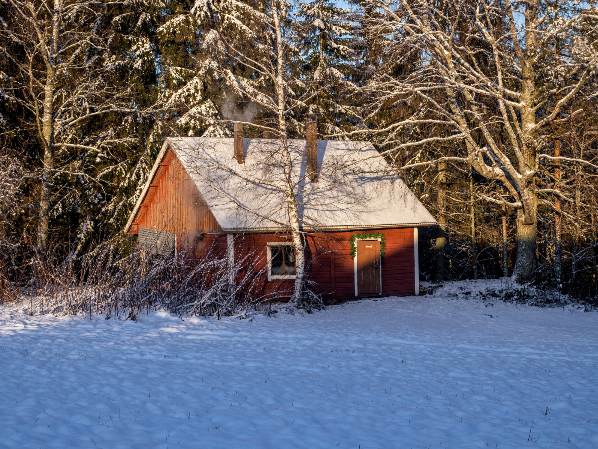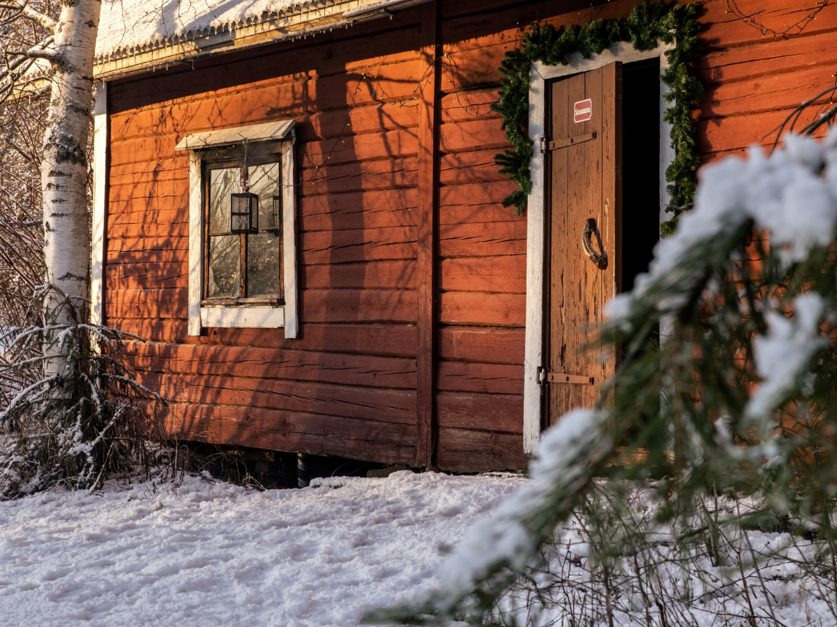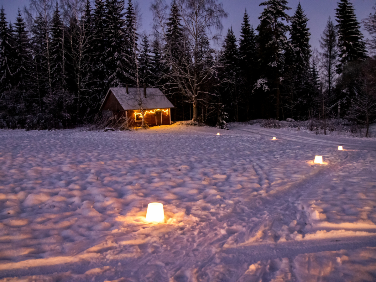 jouluinen savusauna jouluvaloilla VillaValkeassa